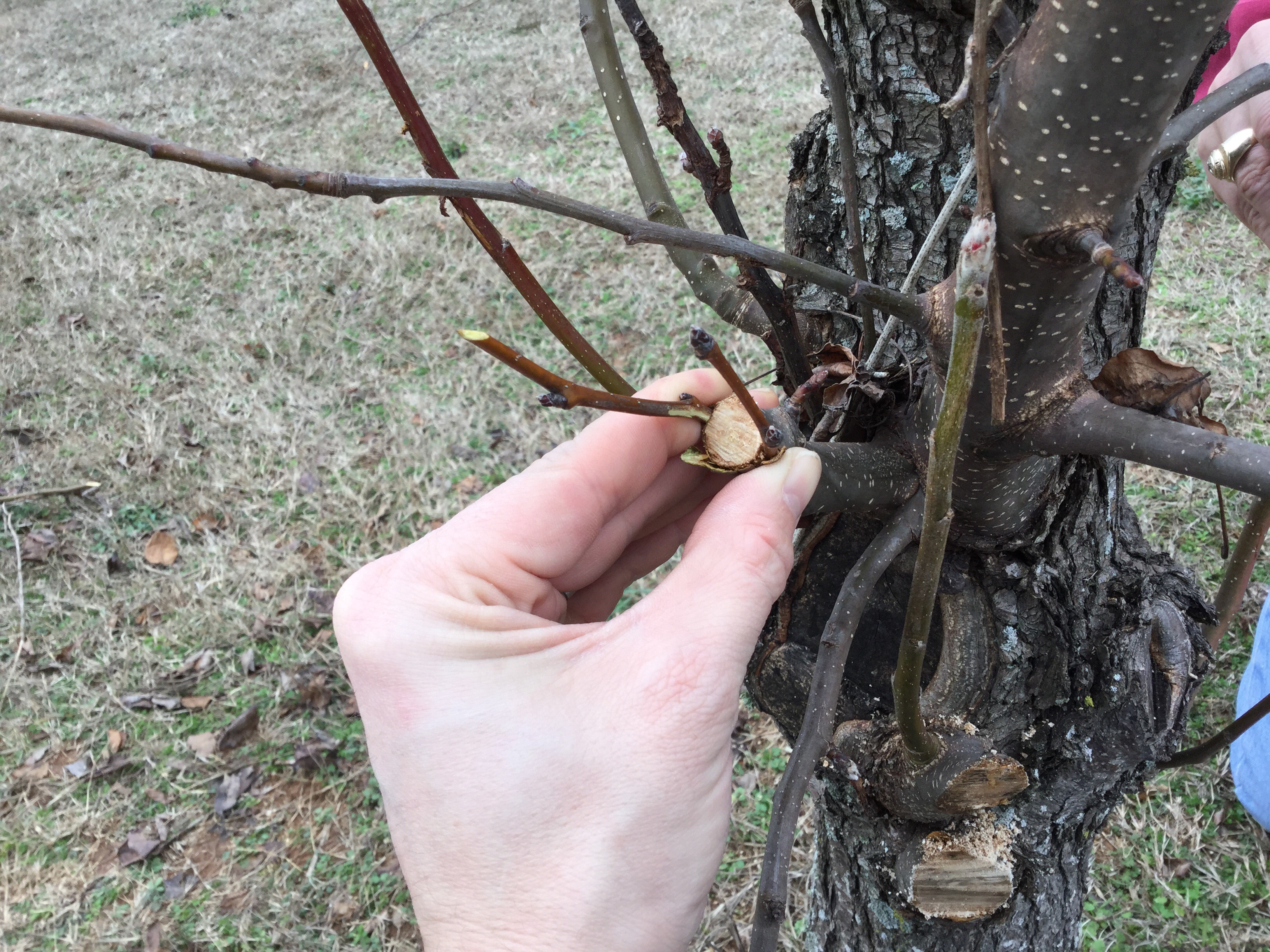 I considered ripping them out of the ground, but heard that they were vigorous and would keep coming back from the roots. After further reading, I learned that the Bradford pear has one redeeming quality. It is similar to the standard fruiting pear tree root stock. So there was my answer, graft fruiting pears onto the base of the Bradford pear. Make them useful!